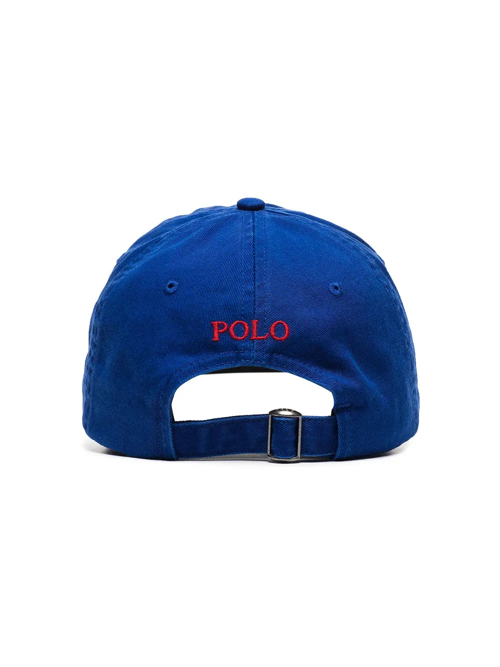 O boné da Polo Ralph Lauren é bordado com o logotipo icônico da marca na frente. O fio vermelho contrastante o destaca ainda mais contra o fundo azul.