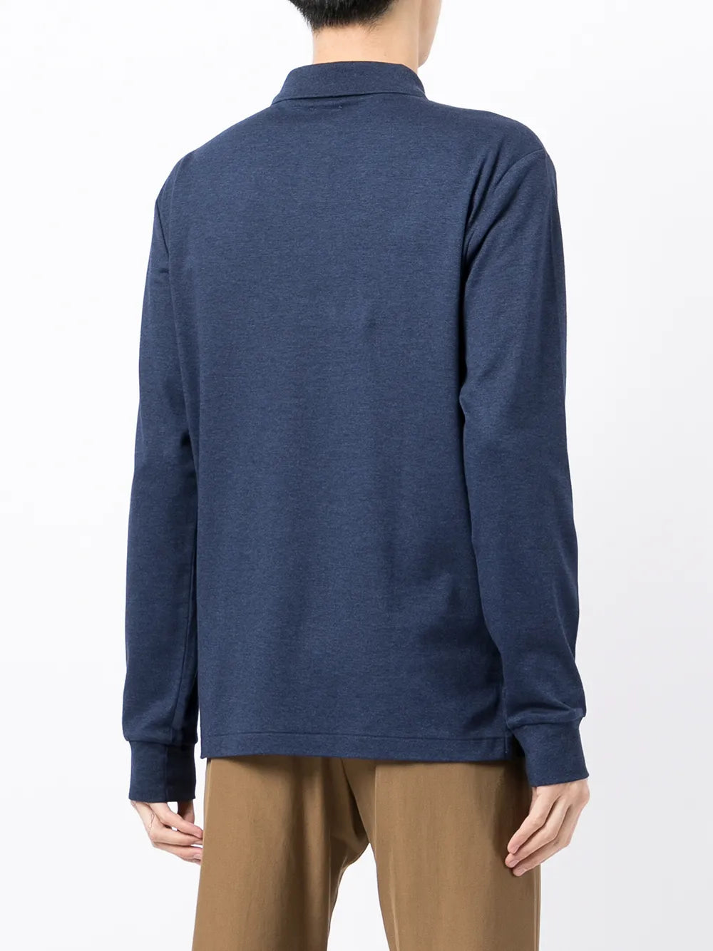 Logotipo bordado em algodão azul no peito, gola polo, carcela frontal com botões, mangas compridas, bainha reta