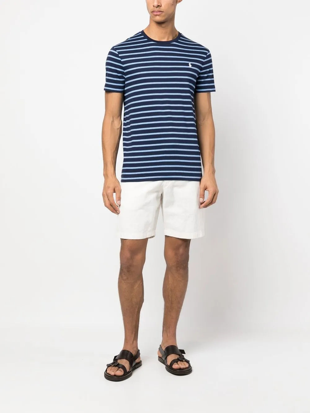 malha de algodão azul, listras horizontais, logotipo bordado no peito, gola redonda, mangas curtas, bainha reta
