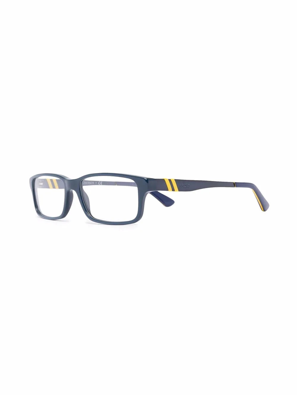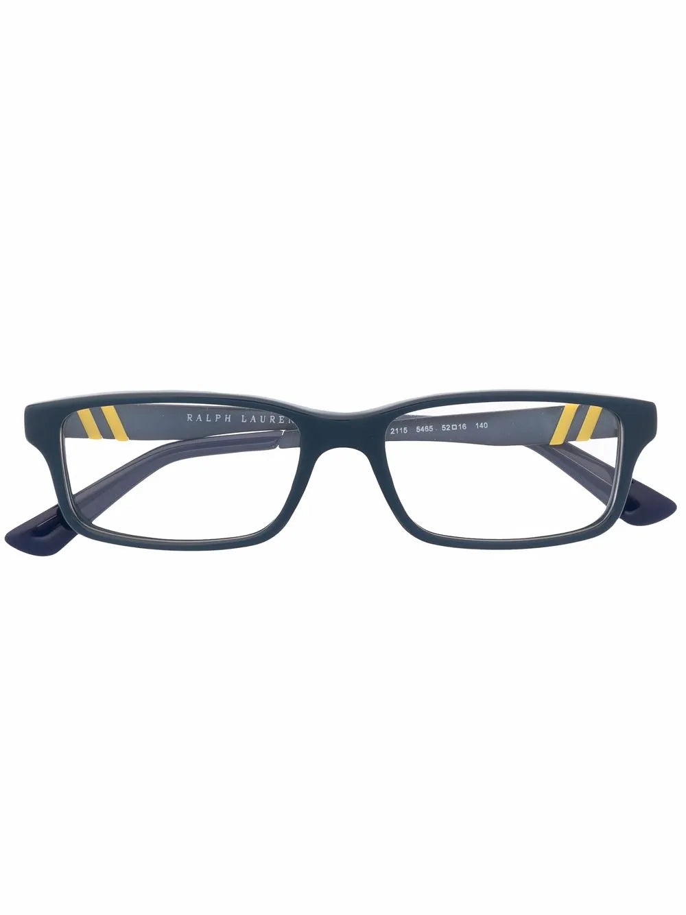 design bicolor azul marinho/amarelo armação quadrada hastes retas pontas curvas Esses óculos vêm com um estojo protetor.