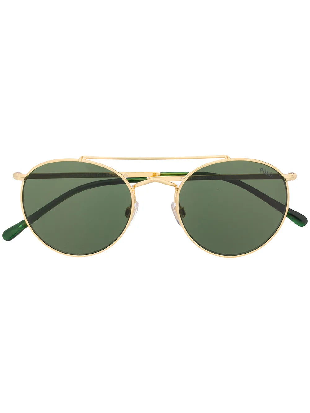 Óculos de sol aviador dourados da Polo Ralph Lauren, com armação estilo aviador, ponte dupla, lentes coloridas, decalque da logomarca na lente, logo na haste e hastes retas com pontas curvas. Este item vem com um estojo protetor.